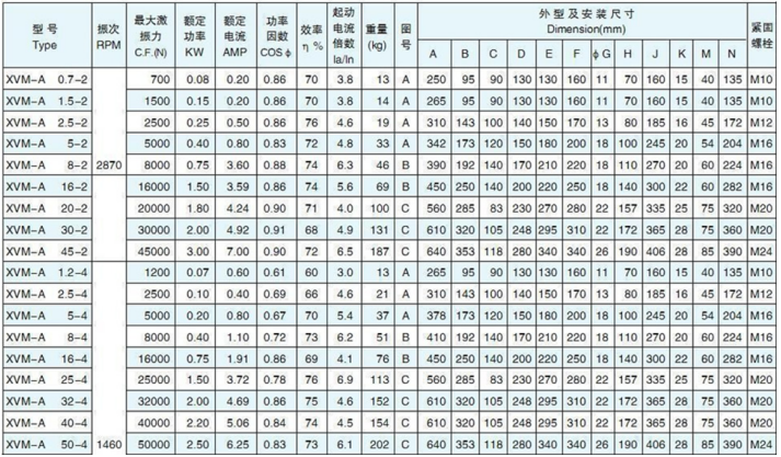 XVM-A振動(dòng)電機(jī)參數(shù):